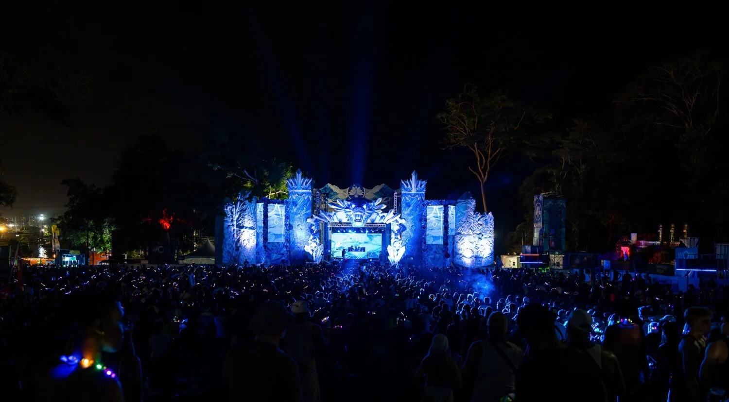 The event emphasizes vibrant, illuminated masks and costumes, creating an otherworldly carnival atmosphere under the night sky. Perfect for those seeking a luminous and visually stunning experience during Spicemas.